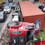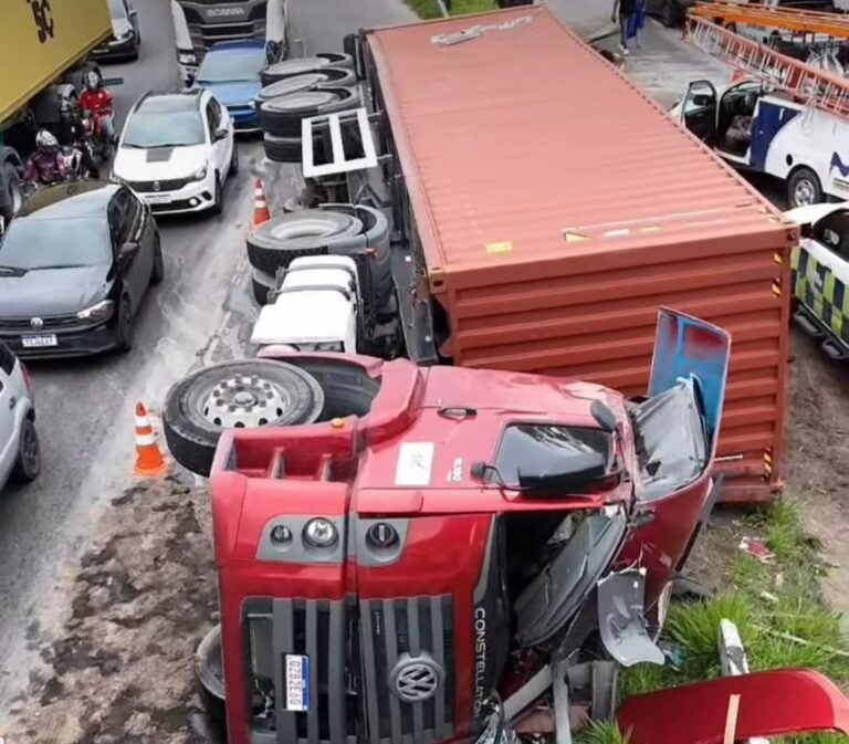 O tombamento do veículo pesado comprometeu o fluxo de veículos, provocando congestionamento e danos à…